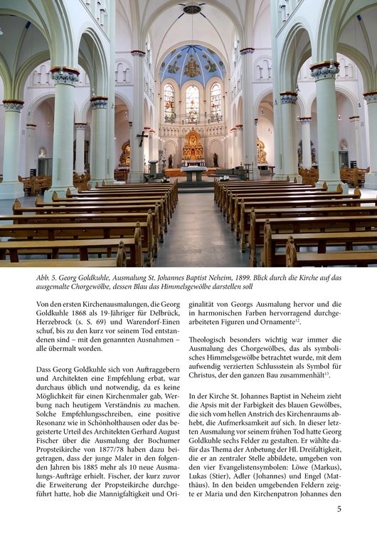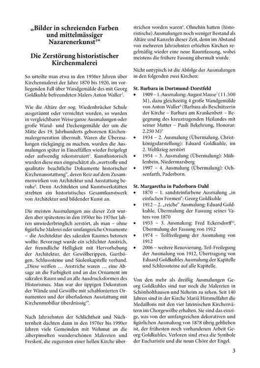 November 2019: "In unvergleichlicher Pracht auf Goldgrund gemalt" Bd. 5 der Reihe „Vergessene Künstler“ Die Publikation stellt erstmalig die prägenden Maler der sog. „Wiedenbrücker Schule“ vor, die weit über die Region Westfalen hinaus Spuren in Kirchen hinterlassen haben: in Hamburg und Bremerhaven, Bawinkel und Emsbüren, Verden, Herford, Rinteln und Göttingen – und zwischen Sauerland, Ruhrgebiet, dem Hellweg und dem Paderborner Land bis nach Thüringen ins Eichsfeld. Mehr als 70 Jahre lang hat die deutschlandweit einzigartige Zusammenarbeit der Werkstätten die Grundlagen für die Erfolge der kleinen Stadt Wiedenbrück im Bereich der kirchlichen Kunst gelegt. Vater und Sohn Goldkuhle waren mitentscheidend für diese Erfolge: Der Vater Georg Goldkuhle (1849-1900), der als eine Art „Wunderkind“ schon als Jugendlicher große Aufträge erhielt – und sein Sohn Eduard Goldkuhle (1878-1953), dessen bedeutende Kirchenraum-Gestaltungen vor einigen Jahren aufwendig wieder freigelegt wurden.