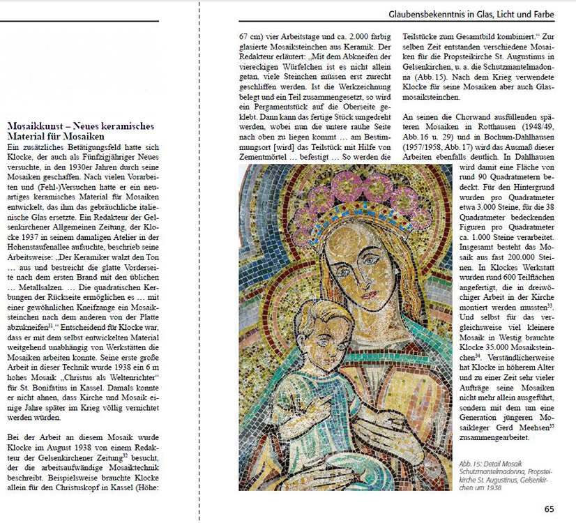 September 2015: es erschien die erste Veröffentlichung über den aus Bielefeld stammenden Künstler Walter Klocke (1887-1965), der für mehr als 50 Kirchen des Ruhrgebiets gearbeitet hat, darunter für 11 Dortmunder Kirchen. Sein Todestag jährt sich zum 50. Mal am 5. November 2015. Der 56 Seiten umfassende Aufsatz von Brigitte und Rolf-Jürgen Spieker, Mitarbeiter der Dokumentationsstelle, über Walter Klocke mit dem Titel „Glaubensbekenntnis in Glas, Licht und Farbe. Walter Klocke – (Glas-)Maler und Mosaikkünstler aus Gelsenkirchen“ ist enthalten in dem Band: Unser Buer. Beiträge zur Geschichte, Bd. 32, 2014/2015, hg. v. Verein für Orts- und Heimatkunde in Gelsenkirchen-Buer, Gelsenkirchen 2015.